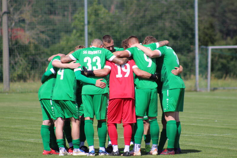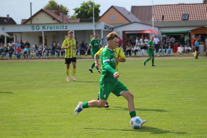 Der Sieg geht auch in der Höhe in Ordnung, vor allem im ersten Abschnitt waren die Hausherren das bessere Team und bei den Abschlüssen sehr effizient. Die Gäste waren sehr unbequem, versuchten von Beginn an das Kreinitzer Spiel zu zerstören, standen sehr eng an ihren Gegenspielern und wollten dann mit langen Bällen auf ihren Spitzen zum Erfolg kommen. Die erste nennenswerte Chance im Spiel hatten die Grün/Weißen, Florian Beyer kam zum Abschluss, traf aber nur den Pfosten. Da waren 6 Minuten gespielt. In der 13. Minute gab es einen dieser lang geschlagenen Bälle und plötzlich war die hoch aufgerückte Kreinitzer Defensive brutal in Not geraten. Gleich zwei Gästespieler liefen in Richtung Roßmüller-Tor, nur Julius Jacobi war mit zurückgelaufen und blieb trotzdem Sieger, konnte in höchster Not klären. Kurz darauf zeigte der gute Schiedsrichter Torsten Fleck das erste Mal auf den Punkt. Bruno Sander war im Strafraum gefoult worden und Sebastian Zipprich übernahm die Verantwortung. Gegen die BSG Stahl Riesa hatte er getroffen, nun aber nicht. Torwart Martin Bade ahnte die Ecke und hielt. Zwei Minuten später war er aber ohne Chance, nach Doppelpass mit Beyer war Sander nun durch und konnte ohne Probleme zur Führung verwandeln. In den folgenden Minuten waren die Schützlinge von Mike Wachsmann klar tonangebend. Immer wieder konnte man sich aus der engen Deckung befreien, ließ Ball und Gegner laufen und kam zwangsläufig zu Chancen. Nach einem Freistoß von Luca Mitternacht war dann René Kögler zur Stelle und spitzelte den Ball an Bade vorbei ins Tor zum 2:0. In Minute 35 gab es dann noch einen Freistoß, diesen von René Kögler getretenen Ball konnte Bade aber nun abwehren. Kurz vor der Halbzeit wurde es dann noch einmal laut auf dem Gelände. Erst traf Rene Kögler zum 3:0 und in der Nachspielzeit John Leon Walther sogar noch zum 4:0. Mit der klaren Führung ging es in die Kabinen und Trainer Mike Wachsmann in dieser noch an, jetzt nicht nachzulassen und auch weiter so effizient zu sein.