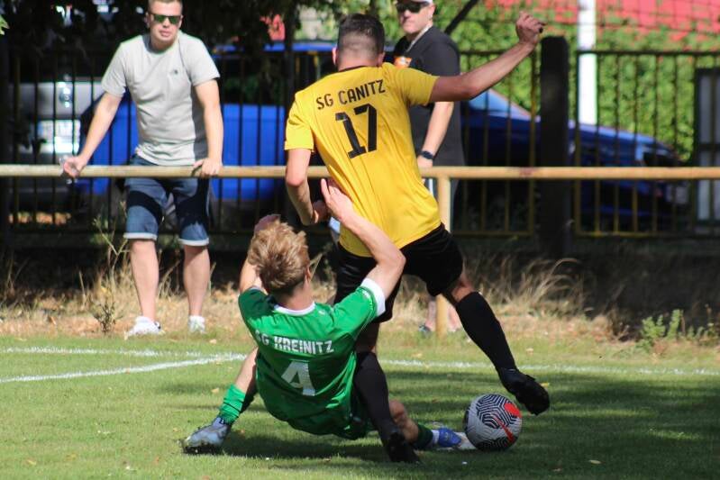 Nach dem guten Start mit 6 Punkten aus zwei Spielen wollte man nachlegen und den nächsten Dreier holen. Bereits in der 6. Minute sollte dafür die Grundlage geschaffen werden, schöner Diagonalball von Luca Mitternacht auf John Leon Walther, der war schneller als sein Gegenspieler und Tim Sadowy im Canitzer Tor ohne Chance. Genauso so hatten es sich die Gäste gedacht, mit dem Führungstreffer war man sofort Herr des Geschehens auf dem Platz. Auch wenn nach vorn nicht viel passierte, hatte man die Ballkontrolle und ließ hinten nichts anbrennen. Nach einer halben Stunde wurde es wieder gefährlich. Wieder war John Leon Walther beteiligt, jetzt ging sein Schuß aber rechts am Tor vorbei. Wenig später Freistoß Lars Kögler, Kopfball Florian Beyer an den Pfosten. Erst in der 36. Spielminute kamen die Gastgeber mal gefährlich vor das Kreinitzer Tor. Da wurde es aber richtig brenzlich. Über die rechte Seite wurde der Angriff eingeleitet, am Ende gab es den Querpass ins Zentrum zum einschussbereiten Tom Sadowy, doch Max Flach roch den Braten und rettete in allerhöchster Not. Klasse Aktion vom Kreinitzer Abwehrspieler! Kurz vor dem Pausenpfiff prüfte Toni Schurig den Canitzer Torwart noch einmal per Kopf, das war aber kein Problem für Sadowy. Dann ging es in die Pause, die knappe Führung stand, aber es waren ja noch 45 Minuten zu spielen.